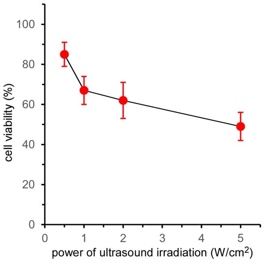 Effect of ultrasound irradiation power on the viability of HeLa cells treated by 5k21 micelles. Ultrasound irradiation was performed using varying ultrasound power (frequency: 1.0 MHz; irradiation time: 2 min; duty cycle: 10%).