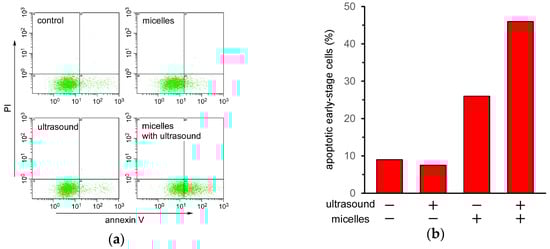 Evaluation of cell death mechanism for HeLa cells treated with 5k21 micelles with and without ultrasound irradiation. (a) Flow cytometry of HeLa cells doubly stained with annexin V-FITC and PI. (b) Percentages of apoptotic early-stage cells under various treatments. HeLa cells were incubated with the micelles for 24 h, after which ultrasound irradiation (frequency: 1.0 MHz; irradiation time: 6 min; power: 0.5 W/cm2; duty cycle: 10%) was performed.