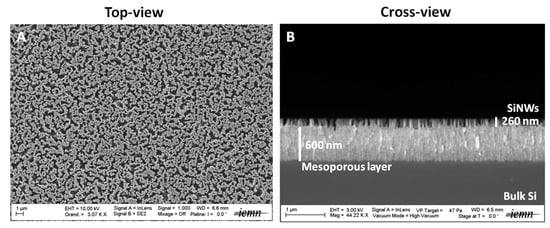 Top-view (A), (scale bar = 1 µm) and cross-view (B), (scale bar = 1 µm) SEM images of SiNWs.