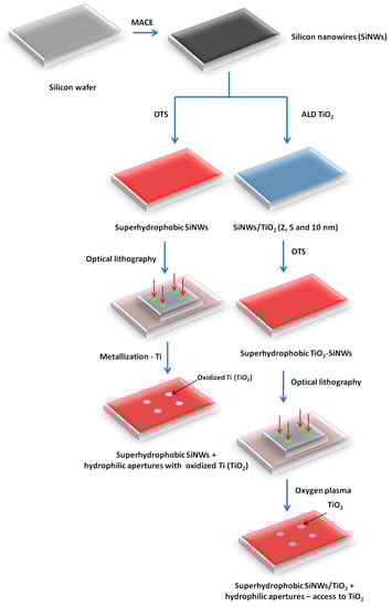 Freshly prepared SiNWs were treated with UV/ozone (UV-O Cleaner, Jelight Company, Inc., 4 mW/cm2 at 220 nm) for 20 min to remove any organic contaminant from the surface and to generate surface hydroxyl groups. SiNWs were then immersed in a 10−3 M solution of OTS (ocatdecyltrichlorosilane) in hexane for 4 h at room temperature, in a dried nitrogen-purged glovebox. The resulting surfaces were rinsed with CH2Cl2, isopropyl alcohol, and dried under a gentle stream of nitrogen. SiNWs display superhydrophobic behavior (WCA value > 150°). To create patterns for making oxidized Ti spots, we used photolithography to remove the OTS locally. The steps are summarized in Figure 2. The same optical mask as for the TiO2-SiNWs was used, with patterns consisting of circles of 800 µm in diameter with an interspacing of 1800 µm. The patterns are created after exposure, post-bake and development. Oxygen plasma treatment was performed for 30 s to remove the resist remaining inside the apertures and to destroy the OTS layer locally. Then, Ti films were evaporated via thermal evaporation by electron beam base evaporation in Plassys MEB 550S (Bestek, Marolles-en-Hurepoix, France). Deposition was achieved using planetary rotation to ensure a good metallic coverage of the SiNWs. Finally, the lift-off was performed by dipping the surface in acetone at 35 °C for 20 min., rinsing with isopropanol, and drying under a nitrogen flow. The oxidized Ti-SiNWs were composed of hydrophilic apertures with oxidized Ti spots for interactions and surrounded by the OTS layer (superhydrophobic behavior) for liquid droplet confinement.