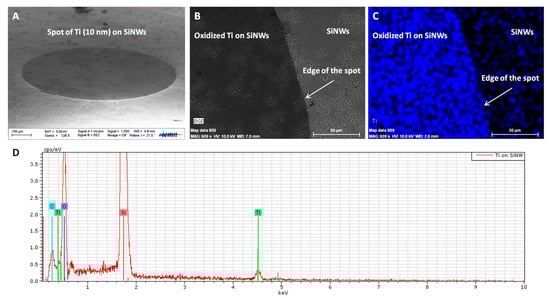 To confirm the presence of TiO2 on both surfaces, we performed energy dispersive X-ray spectroscopy (EDX) analyses on the obtained interfaces. Figure 3 shows how EDX was performed on SiNWs presenting oxidized Ti spots (800 µm in diameter). On Figure 3A, we can clearly identify the oxidized Ti spot on the SiNWs’ surface. Figure 3B,C shows the SEM image of the edge of the oxidized Ti-SiNWs’ spot (dark area) and the corresponding EDX mapping, respectively. The blue color corresponds to the Ti element. The EDX spectrum, displayed in Figure 3D, confirmed the presence of the Ti, O, and Si elements.