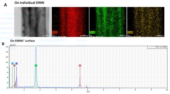 EDX analysis was also performed on TiO2-SiNWs. On Figure 4A, we can clearly see that an individual SiNW is uniformly covered by a TiO2 layer, proving the conformal deposition of TiO2 on SiNW obtained by ALD. EDX analysis on a larger scale showed the whole coverage of SiNWs by the TiO2 layer (Figure 4B). EDX mapping and analysis confirmed the presence of Ti and TiO2 around the SiNWs.