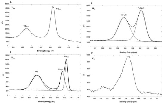 Figure 6 shows the high-resolution XPS spectra of TiO2-SiNWs. As for oxidized Ti-SiNWs, the high-resolution XPS spectrum of Ti2p showed two main peaks located at 459.29 eV (Ti2p 3/2) and at 465.16 eV (Ti2p 1/2) (Figure 6A). Both the split spin-orbit value of 5.87 eV and the symmetrical Ti2p regions showed that Ti4+ was also dominant on the surface, as already observed for oxidized Ti-SiNWs. However, the Ti to O ratio of TiO2 film was slightly higher, with a value of 0.31 compared to the standard TiO2 stoichiometry (Ti/O = 0.5), which correlates well with the deposition of TiO2 materials. Oxygen defects were still present, but with less influence of Ti–OH groups and SiOx, as we can see on Figure 6B,C. Concerning the high-resolution spectrum of O1s, this can also be fitted with two peaks (Figure 6B). The peak at 530.82 eV corresponds to the lattice O (O–Ti–O), while the second (less intense than for oxidized Ti-SiNWs) at 532.82 eV was from the surface hydroxyl groups (Ti–OH). The peak corresponding to lattice O showed that Ti4+ was dominant in oxidized Ti film. On Figure 6C, the Si2P high-resolution XPS spectrum shows much lower signal intensity than for that obtained from oxidized Ti-SiNW (2.26 atm. % vs. 19.7 atm. %). This is probably due to the better surface coverage of SiNWs achieved by the ALD method. Finally, in Figure 6D we can also see the C1s contribution, probably coming from surface contamination by non-oxidized and oxidized carbon species, with two peaks at 285.48 eV and 289.6 eV, respectively.
