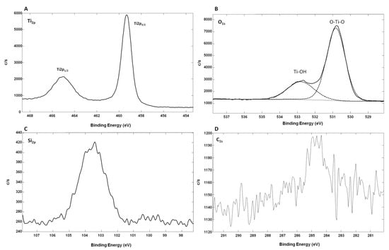 In addition, and to better assess the chemical state of Ti, X-ray photoelectron spectroscopy (XPS) analyses were also conducted. Figure 5 shows the XPS spectra from oxidized Ti-SiNWs. The Ti2p peak has a significant split spin-orbit component (Δmetal = 6.1 eV). It is known that the splitting value can vary as a function of the chemical state (e.g., Δoxide = 5.7 eV). In the high-resolution XPS spectrum of Ti2p, we have two main peaks located at 459.34 eV (Ti2p 3/2) and at 465.14 eV (Ti2p 1/2) (Figure 5A). In this case, the split spin-orbit value is 5.8 eV, thus confirming the oxidation of the Ti film. The Ti2p regions were symmetrical, indicating that Ti4+ was dominant on the surface [28]. Also, the Ti to O ratio of oxidized Ti films was 0.22 compared to the standard TiO2 stoichiometry, which presents a Ti/O ratio value of 0.5. This showed that many oxygen defects are present on the film surface. In addition, as we can see on the Si2P high-resolution XPS spectrum, oxidized silicon may also contribute to O1s signal intensity (Figure 5B). We can also conclude that the observed TiO2 is coming from partial oxidation of the Ti film deposited on SiNWs. Concerning the high-resolution spectrum of O1s, this can be fitted with two peaks. The peak at 530.90 eV corresponds to the lattice O (O–Ti–O), while the second peak at 533.14 eV was from the surface hydroxyl groups (Ti–OH) [29]. The peak corresponding to lattice O showed that Ti4+ was dominant in oxidized Ti film. In Figure 5D, we can see the C1s contribution (8.7 atm. %), probably due to surface contamination by non-oxidized and oxidized carbon species with two peaks at 285.6 eV and 289.73 eV, respectively.