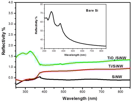 Reflectivity measurements of Si (insert), SiNWs, TiO2-SiNWs and oxidized Ti-SiNWs.