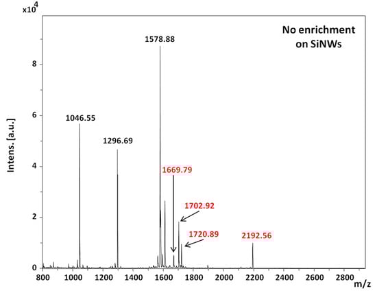 The concentration varied from 400 fmol/µL to 4 fmol/µL. Then, different SiNWs with TiO2 or oxidized Ti films of different thicknesses were assessed. Thicknesses of 2 nm, 5 nm and 10 nm and 5 nm and 10 nm for TiO2 films deposited by ALD and oxidized Ti deposited by thermal evaporation followed by air oxidation, respectively, were used. When 1 µL was allowed to dry on all surfaces, no enrichment was obviously observed, as can be seen in Figure 8, where all the seven peptides were detected on the SiNWs surface.