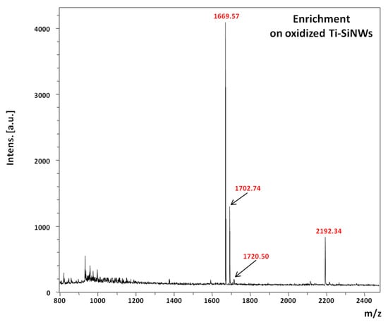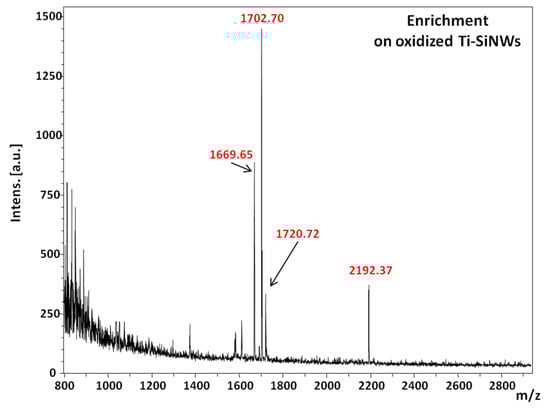 Finally, the performance of the oxidized Ti-SiNWs (10 nm) interface was examined in a more complex biological sample. To do so, we used a solution of serum composed of 50% fetal bovine serum (FBS) in phosphate buffer saline (PBS) (v/v). Then, a spike of phosphopeptide mixture (to reach 400 fmol/µL), without any further treatment, was made. 3 µL of the resulting mixture was incubated on the oxidized Ti-SiNWs’ surface for 10 min, followed by appropriate rinsing and drying as already described above. Figure 10 shows the MS spectrum of the phosphopeptide mixture spiked in FBS solution. As we can see, only peaks related to [M + H]+ ions of phosphorylated peptides were detected at 1669.65 m/z, 1702.70 m/z, 1720.72 m/z and 2192.37 m/z.