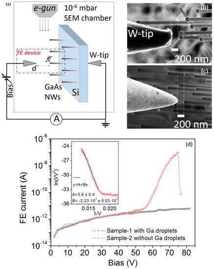 Field emission (FE), which is the quantum mechanical tunneling of electrons from the material surface through the vacuum energy barrier when a sufficiently high electric field is applied, can be exploited for several applications in vacuum electronics, such as flat panel displays [1,2], electron [3] and X-ray sources [4], and microwave devices [5]. Nanostructures represent the best candidates as field emitter sources due to the high aspect ratio that enables high local field enhancement. Several one-dimensional (1D) and two-dimensional (2D) carbon-based nanostructures have been characterized as field emitters: Aligned carbon nanotube (CNT) films [6,7,8], single CNT [9,10], CNT networks [11,12,13], graphene [14,15,16], and graphene oxide nanosheets [17]. One-dimensional semiconductor nanostructures, such as nanowires (NWs), nanorods, nanoparticles, etc., have also attracted considerable attention due to wide applicability for functional devices in the field of optoelectronics [18,19], photovoltaics [20,21], as well as vacuum electronics [22]. Several studies on NWs (GaN [23,24], ZnO [25], W5O14 [26]) and nanoparticles (In2O3 [27], GeSn [28]) have been reported. GaAs, which is one of the most popular III–V compound semiconductors with high electron mobility and direct band gap, in the form of nanowires (NWs) can have interesting properties for FE applications. A particularly interesting III–V nanomaterial system is comprised of self-catalyzed GaAs NWs grown by the vapor-liquid-solid method [29,30], allowing the direct integration of high quality GaAs structures on Si without the use of Au or other foreign catalyst metals, which would introduce deep level traps in Si [31]. Despite that, very limited research on FE from nanostructured GaAs is available to date. Porous GaAs with closely spaced nanometric crystallites [32], obtained by an anodic etching of n-type (110) GaAs, was shown to be a weak (10 nA for 4 kV applied bias) and unstable emitter, with large current fluctuations and surface modifications within a few hours. One-dimensional pillars fabricated by the electrochemical etching of (111) GaAs substrate [33,34] resulted in a diameter (~2 μm) that is too thick for FE applications. Superior performance was reported for GaAs nanowires fabricated via the electrochemical etching of an anodic etched n-type GaAs (111) wafer [35]. Nanowires were actually aggregated as bundles with an average top diameter in the range of 30–80 μm. Experimental data showed that such bundles work as field emitters with a low turn-on field (EON ≈ 3 V/μm). A similar turn-on field (EON ≈2 V/μm) was measured in a parallel plate configuration (sample area 40 mm2) for aligned GaAs NWs fabricated via direct etching by an H plasma of the GaAs wafer covered with an Au film [36]. However, a systematic study of field emission from a single GaAs NW or from an array GaAs NWs is still missing.