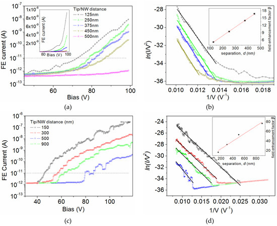 As a confirmation of the dependence of as an increasing function of distance, we show in Figure 2 the evolution of the characteristics by varying the separation between the tungsten tip (anode) and the apex of a GaAs NW on Sample-2. In Figure 2a, we show the recorded curves for tip-sample separation in the range 125–500 nm. We clearly observed a rapid increase of the current above 70 V. The corresponding FN plots reported in Figure 2b confirm the FE nature of the measured current. From the slope of the plots, we extracted the field enhancement factor for each value of , and the inset shows the experimental evidence of a linear dependence of vs. . According to this behavior, we can consider the value to be rather high taking into account the small separation distance. A similar behavior has actually been measured in several different locations on Sample-2. As an example, we report in Figure 2c another set of measurements performed in a different location by varying the separation in the range 150–900 nm. We observe that in both cases the emitted current raises from the noise-floor level (10−12 A) for at least four orders of magnitude in a voltage range about 40–50 V wide. Again, we extracted a clear linear dependence of vs. confirming that increases with . The difference on the absolute value of is easily understood by considering that many factors may influence it, such as the length of NW as well as small local variations of the workfunction.