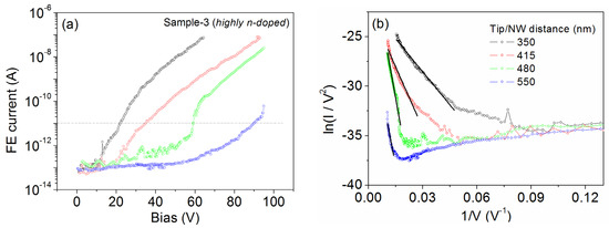 FE characterization of highly n-doped GaAs NWs. (a) characteristics measured for Sample-3 for different values of the separation . (b) FN plots and linear fittings (solid lines).