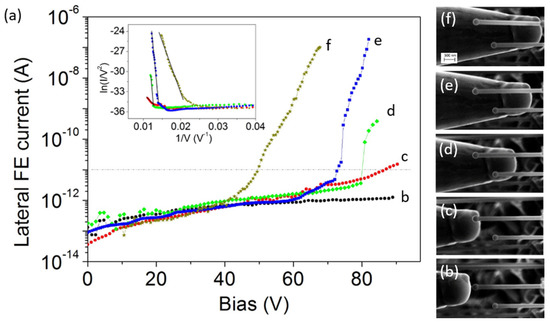 (a) characteristics measured in the lateral FE configuration. Curves refer to the SEM images (b–f). Inset: FN plots and linear fits.
