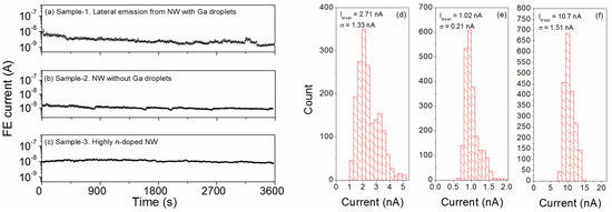 Finally, one important issue in FE characterization is the emission stability and lifetime. Previous works on GaAs-based field emitters [32,35] report very unstable current emission vs. time. We applied a constant voltage and recorded the emission current vs. time , with a sampling time of 1 s. In Figure 5, we show the current variation as a function of time for the lateral emission from NW with Ga droplets (Figure 5a), for the undoped NW without Ga droplets (Figure 5b) and for the highly n-doped NW (Figure 5c). The samples showed very stable behavior, with constant emitted current, without evident degradation for a testing operational time of 1 h. Statistical analysis of the measured current values is reported for Sample-1 (Figure 5d), Sample-2 (Figure 5e), and Sample-3 (Figure 5f). A very good stability was obtained on a time period of about 1 h for Sample-2 and Sample-3 (current emitted from the NW apex), with less than 20% deviation from the average current . On the contrary, larger fluctuations were recorded for the laterally emitted current. The reduced stability in the case of lateral emission can be related to the different location of the anode (parallel to the sidewall). The application of a high electric field can bend the nanowire towards the other electrode due to the electrostatic attraction, and this results in the observed instability. The high current stability vs. time can be considered a very good result compared to reported instabilities and confirms that high-quality aligned GaAs nanowires are suitable for long operational FE devices.