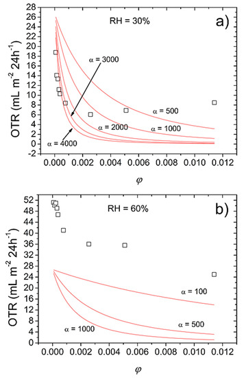 Experimental (symbols) and predicted (solid lines) OTR values of bionanocomposite hybrid coatings as a function of filler volume fraction (ϕ) for different aspect ratio (α) of mica platelets at (a) 30% RH and (b) 60% RH, according to Cussler’s model (Equation (1) in the text).