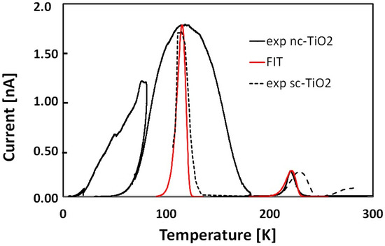 In single crystal TiO2, two peaks related to two discrete energy levels at 120 and 230 K are present, which can be described in terms of standard TSC emissions [26] as given in Equation (16). In nanostructured TiO2, we observe a much broader peak at 120 K, which cannot be described in terms of standard single-level TSC emission, and a peak at 220 K, rather similar to the one measured in single crystal TiO2. In the figure, a best fit of this latter peak is shown, obtained with a standard TSC analysis (Equation (16)), a very high capture cross section, σn ≈ 10−10 m2 and ≈ 0.8 eV, ≈ 1014 cm−3.