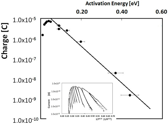 As described in the previous section, to investigate the DoS shape we evaluated, for each scan, the activation energy in the rising foot range of each peak and the corresponding total emitted charge. The result is shown in Figure 5, where the total charge is plotted as a function of the activation energy. Results evidence a mono-exponential DoS: (E), in the energy range 0.1–0.6 eV with tailing factor.