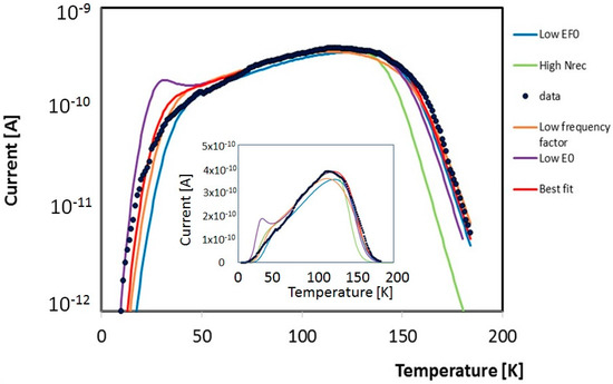 Fit procedure of data measured during a unique TSC emission in the range 5–200 K (convoluted from data of Figure 3). Red: best fit obtained with Nrec = 75 × 1020 m−3, frequency factor ν0 = 4 × 1012 s−1, EF0 = 66.5 meV, EL = 60 meV, NL = 1020 m−3. Green: same with higher concentration of recombination centres Nrec = 6 × 1022 m−3, violet: same with lower EL = 50 meV, orange: same with lower frequency factor ν0 = 2 × 1012 s−1, blue same with lower initial Fermi level EF0 = 72.2 meV.