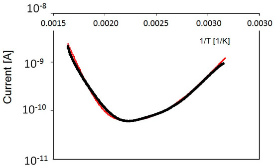 Current measured as a function of reciprocal temperature during a quasi-stationary heating process, in the range 300–600 K with no priming. Dark: data, red: best-fit.