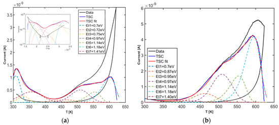 To analyze the effect of water vapor on TSC data, we first primed the sample by keeping it in a controlled humid environment (rh = 20%) in dark at room temperature ( = 300 K) for selected time intervals, up to 14 days. Then, a TSC heating/cooling cycle has been performed by fluxing dry air with a pressure slightly higher than atmosphere, in view to measure only emissions originated during charging in the storage period. As an example, Figure 9a,b show TSC experimental data obtained after 2 and 4 days storage respectively. Curves labeled “data” report experimental measurements, while those labeled TSC show the thermally stimulated currents obtained by subtracting the current measured during the cooling scan from that measured during the heating scan. TSC emissions are observed within two distinct ranges of temperatures: one from ambient temperature, up to 400 K, the other one above 400 K.