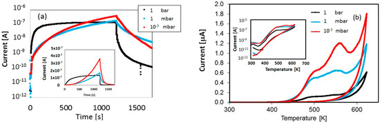 (a) Photocurrent measured during priming by illuminating with a Xe lamp the nc-TiO2 sample in an He atmosphere of different pressures at T = 300 K; (b) TSC measured after priming with 1 bar,1 mbar, 10−3 mbar. Heating/cooling cycles are performed in He atmosphere with 1 bar pressure.