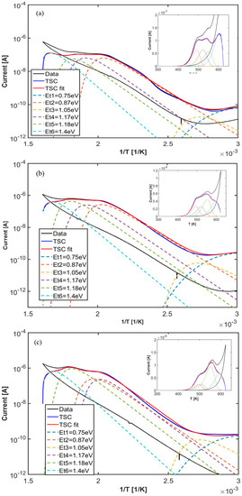 The six peaks used to best-fit our TSC curves are characterized by the same (, ), within errors, used to fit TSC measurements in the humid environment (apart of the shallowest two levels that here are present in only one component). Here, at every pressure analyzed, shallowest levels have negligible concentrations with respect to deepest levels. Looking to plots in Figure 11, we observe a good agreement between fit and data on a four-orders of magnitude scale. Logarithmic plots are shown as a function of 1/T: the observed linear trend is in favour with our previous observation, that hopping conduction in this high-temperature range is negligible.