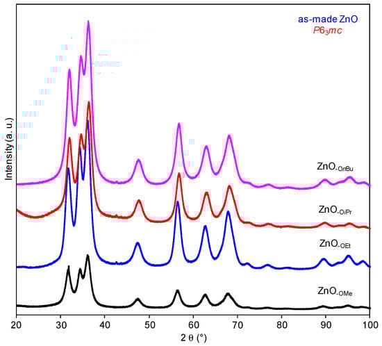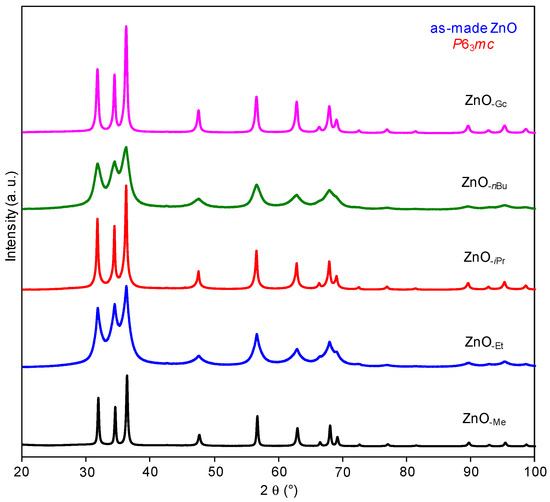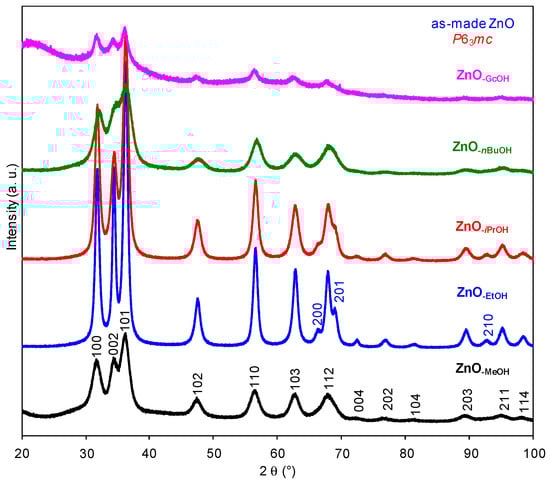 When EtOH, iPrOH and nBuOH were respectively used to replace MeOH in the preparation of ZnO-MeOH, the corresponding nanoscaled ZnO-ROH (R = Et, iPr, nBu) particles were obtained. All ZnO-ROH NPs have a same crystal structure (space group: P63mc) verified by PXRD patterns (Figure 1) as that of ZnO-MeOH, but the ZnO-EtOH and ZnO-iPrOH show a relatively narrow and strong diffraction peaks compared to that of ZnO-MeOH and ZnO-nBuOH, implying that use of different alkyl alcohols as a reactant and a reaction solvent can effectively influences the crystalline particle size of zinc oxides obtained and the results show a strong diffraction peak-broadening/weakening effect with decreased grain size [76]. This phenomenon is probably caused by the change of growth rate of ZnO particles influencing by decomposition temperature, dispersibility and solubility of formed intermediate Zn(OR)2 in oleylamine during the thermal decomposition.