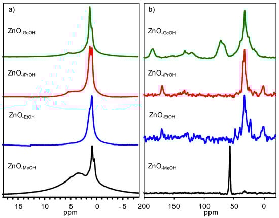 Solid-state (a) 1H and (b) 13C NMR spectra of as-made ZnO NPs obtained by using different alkyl alcohols as reactants under an identical condition except for ZnO-GcOH.