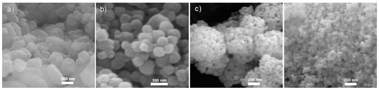 The representative SEM images of obtained ZnO NPs by the directly thermal decomposition and calcinations of Zn(OMe)2 and Zn(OiPr)2; (a) ZnO-OMe; (b) ZnO-OiPr; (c) ZnO-Me; and (d) ZnO-iPr.