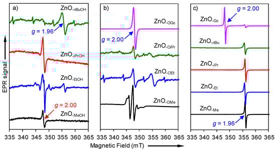 Room temperature EPR spectra of ZnO NPs derived from different synthetic approaches, for (a) ZnO-ROH; (b) ZnO-OR; and (c) ZnO-R (R = Me, Et, iPr, nBu and Gc).