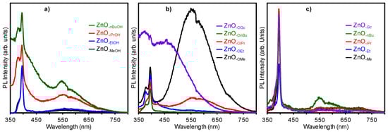 Photoluminescence spectra of (a) ZnO-ROH; (b) ZnO-OR; and (c) ZnO-R (R = Me, Et, iPr, nBu and Gc) NPs derived from different synthetic approaches.