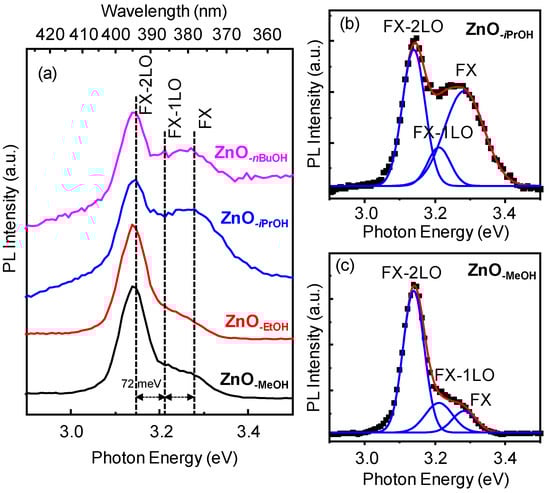 (a) PL spectra of ZnO-ROH (R = Me, Et, iPr and nBu) NPs in the UV range; (b,c) spectral fitting of the peaks for ZnO-iPrOH and ZnO-MeOH, respectively.