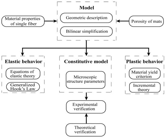 The microstructure of electrospun nanofibrous mats is similar to that of nonwoven fabric. However, the former is special in that there is no adhesion between the connecting points of the fibers, so the interaction force between fibers can be neglected. In this study, electrospun nanofibrous mats with its actual microstructure were modeled here in a finite element environment using a parametric modeling technique. The nature of the electrospun nanofibrous mats was captured by introducing fibers directly into the model according to their orientation distribution in mats. The variability of elastic–plastic mechanical properties of constituent fibers was also introduced. The precision of the model was assessed in comparison to tensile loading experiments under different conditions (the fiber volume fraction, the dimensions of the test specimen, and the fiber curvature). The methodology for the micromechanics constitutive model is shown in Figure 1.