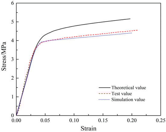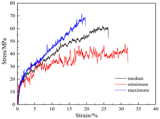 Experimental stress-strain curves of SF/PCL nanofibrous mats compared with theoretical analysis and simulation results are shown in Figure 16. The simulation results are consistent with the experimental results, but the theoretical value was greater. Through analysis, we found that theoretical analysis and calculation contained fiber tensile contributions in all directions, while experimental measurement specimens and simulation models truncated some fibers.