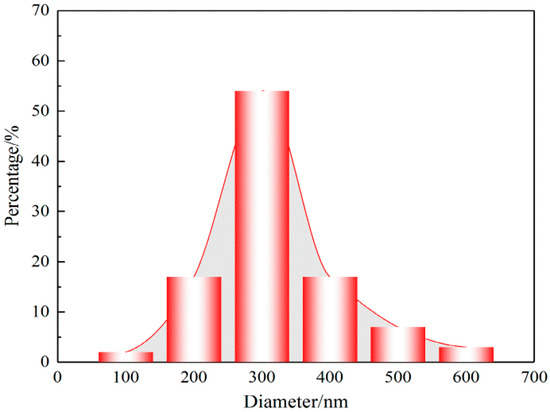 Using the methods described in the materials (Section 2.1), the FE-SEM images of the prepared electrospun SF/PCL nanofibrous mats are shown in Figure 5. The nanofibers were rod-shaped. The surfaces of the fibers were smooth without beads. Furthermore, there was no bonding at the intersection of fibers. Aided by the Image-Pro Plus images, the diameter of fibers was found to be mainly 300 nm (Figure 6). The diameter of fibers had an average of 272 nm and a standard deviation of 80 nm. To understand the distribution of nanofibers in mats, FOD was analyzed using the DHU-11 nanofiber orientation image analysis system. The results showed that the FOD approximated a uniform distribution (Figure 7).