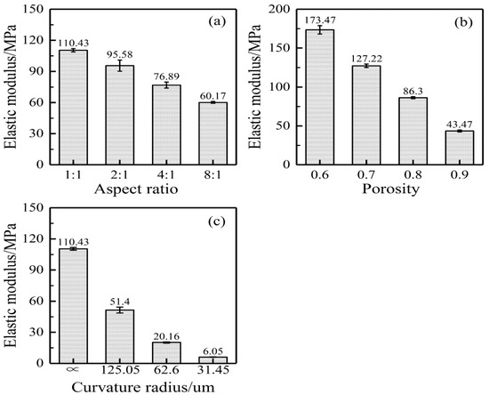 The length-width ratio influences the tensile results of the nanofibrous mats. Three groups of models were established for the tensile simulation test, with each group having four situations. The length-width ratios of mats were respectively 1:1, 2:1, 4:1, and 8:1. All models had the same porosity (75%), and the results are shown in Figure 10a. With an increase in the length-width ratio, the elasticity modulus decreased. When it was 8:1, the elasticity modulus was about half of that under 1:1.