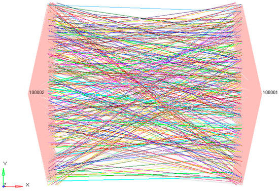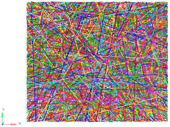In the 100 × 100 μm grids, 1000 straight fibers were distributed randomly, which was generated through Matlab R2012a programming (Natick, MA, USA). The analysis model of the nanofibrous mats is shown in Figure 9. There were 93,871 actually generated elements, and its thickness was 2.27 μm.