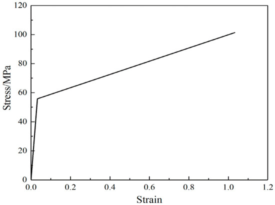 To further assess the predictive capability of the constitutive model, uniaxial tensile loading experiments were conducted under additional conditions (aspect ratios = 1; porosity = 75%). The model was calculated and analyzed using Abaqus 11.3 software (Providence, RI, USA). Based on theoretical analysis of the fiber web and fiber linear elasticity, fiber deformation was directly related to fiber web deformation, and elasticity modulus of the fiber web was in direct proportion to that of the single fibers, as shown in Equation (12). Therefore, if the stress-strain curve of fiber web is bi-linear, the fiber material parameters should also be bi-linear. It was assumed that the fibers presented a linear stress-strain response after yielding, while the stress-strain ratio to that in the elastic phase was the same as the ratio in the nanofibrous mats (2.6:98). The stress-strain curve of a single fiber is shown in Figure 13.