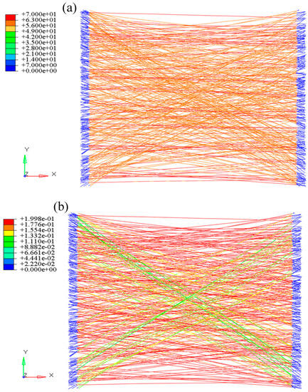 For the experimental loading in the simulation, 123 degrees of freedom were constrained for all nodes in respective 5 μm regions at left and right ends with a tensile elongation of 0.9 μm. Meanwhile, as some fibers were in up and down directions, to clamp left and right sides, only one side could be clamped or neither could be clamped. These types of fibers would result in a singularity of the stiffness matrix, so these fibers were deleted (these fibers would not influence the tensile modulus in left and right directions).