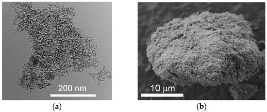 The carbon-based material (Figure 1) was formed by detonation synthesis. Synthesis of nanodiamonds was carried out by detonation of solid explosives in an inert atmosphere. The release of very large capacities of energy occurred due to the breaking of chemical bonds in the front of the detonation wave. The highly-dispersed carbon material was condensed from the liberated carbon under conditions of high temperatures 3000–4000 K and pressures 20–30 GPa. Unpurified material contained 25.0–50.0 wt % of nanodiamonds. The medium purity material was chosen for the studies. The purified material consisted of nanodiamonds, onion-like particles, and a certain amount of amorphous carbon. The material was purified by the Federal Research and Production Center “Altai” (Biysk, Russia). The nanodiamonds consist of a crystalline diamond core and a non-diamond shell with functional groups on the surface.