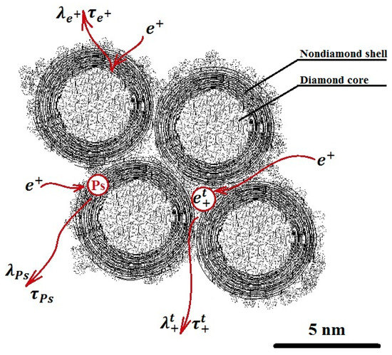 It should be noted that there is no component with lifetime 100–110 ps associated with the annihilation of positrons in the bulk of diamond [34,35,36]. For defect-free diamonds, the diffusion length is Ldiff = 162 nm [34]. Based on the fact that the average size of the nanodiamond is less than 10 nm (Figure 4) the probability of positron annihilation from this state is negligible.