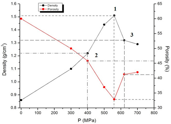 The compacted carbon powders were used for hydrogen saturation and positron annihilation measurements. The compaction process was carried out on hydraulic press at the room temperature in the pressure range of 100–700 MPa without using a binder. Under the pressure below 400 MPa, the material stays uncompacted, while under pressure above 620 MPa, it destructs due to high internal stresses. The samples are pills with 5 mm diameter and mass of 0.1 g. The density of the sample was calculated through the ratio of the mass of the compacted sample to its volume. The densities of samples 1, 2, and 3 were 1.51, 1.22, and 1.32 g/cm3 and porosity was 32.9, 45.8, and 41.3%, respectively (Figure 4). Porosity was calculated by the formula: