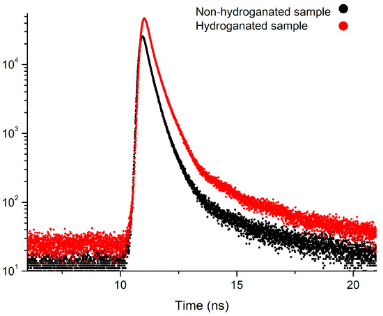 The positron annihilation studies of nanodiamond samples before hydrogenation reported three components in the positron lifetime spectra indicating positron trapping (τT), ortho-positronium formation (τo-Ps), and free positron annihilation (τfree). The samples before hydrogenation are practically identical. The component τfree averaged 0.31 ± 0.04 ns with the greatest intensity 82%. The value of this component is slightly lower than of the component reported by other authors in nuclear graphite samples, i.e., 0.36–0.38 ns [28]. Our estimation of positron lifetime in the graphite crucible (LECO) after degasification shows two components, τfree = 0.28 ± 0.02 ns and τT = 0.42 ± 0.01 ns. The short lifetime observed for graphite has been ascribed to free positrons and the longer lifetime has been ascribed to surface-trapped positrons [29,30]. This fact confirms our assumptions that τfree is related with the annihilation of free positrons in a graphite-like structure. Small fluctuations of the value of this lifetime component after hydrogen exposure do not change this interpretation.