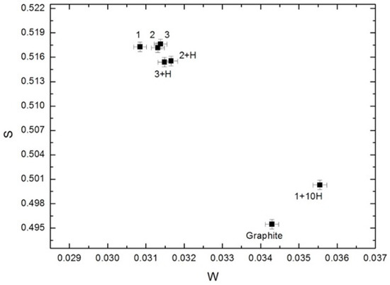 Both the S- and W-parameters depend on the concentration and type of defects [25]. The authors of work [26] suggest the parameter R = S/W that does not depend on the concentration of defects and is determined only by their type. The graphical method for analyzing the parameters of the DBS shape was used. According to [27], if the experimental values of the S- and W-parameters for the set of samples are in the straight line of the plot S = f(W), this means that the predominant positron traps in the samples are similar types of defects and the R-parameter is determined by the inclination of the straight line. Thus, the change of the straight line (S, W of the plot S = f(W)) represents the change of the R-parameter and predominant positron trapping state.