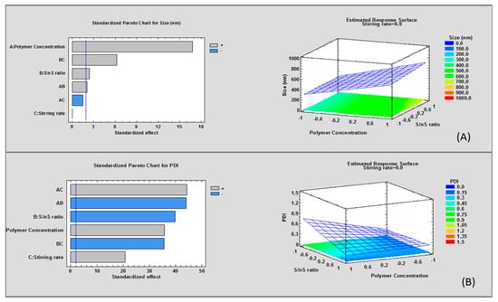 The pareto chart of the model shows that polymer concentration and S/nS ratio significantly (p < 0.05) influence output, that is mean particle size. Particle size values were significantly bigger (507.8 ± 47.9–919.3 ± 53.2 nm) for formulations with high polymer concentration (25 mg/mL) and high S/nS v/v ratio (0.5).