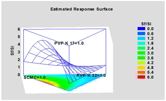 Results are plotted in a simplex centroid, mixture design by statgraphics software (Figure 4). PVP K17, PVP K32 and SCM correspond to vertex. Binary mixture and ternary mixture combining the three cryprotectans must give a total amount that correspond two times the weight of the nanoparticles. The most appropriate model for this mixture design is a special cubic design because the R-squared is 99.88%, while linear and quadratic designs show a R-squared of 20.97% and 97.66%, respectively. Response surface plot shows that SCM exhibits higher Sf/Si with respect to PVP K17 and PVP K32.