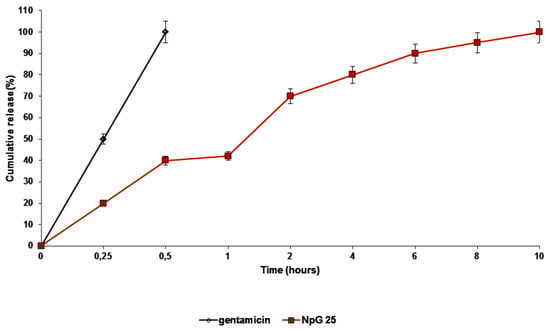 The release of gentamicin sulfate from nanoparticles (batch #25) was evaluated in PBS pH 7.4 in order to mimic physiologic conditions. Gentamicin sulfate loaded Nps show a biphasic release profile with nearly 40% of gentamicin released after 1 h and 70% after 2 h. The complete release was reached in 10 h (Figure 6).