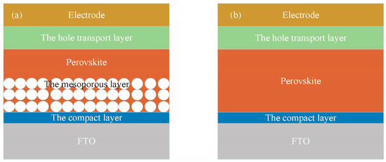 There are two common types of PSC. These two types include mesoporous and planar structures, which have been depicted in Figure 1. As shown in Figure 1a, the compact layer has the ability to avoid direct contact between the fluorine-doped tin oxide (FTO) and hole transporting materials (HTM), which is also named the electron blocking layer. The inorganic semiconductor nanomaterials are commonly used to prepare the compact layer, such as TiO2, SnO2, ZnO, and so on. The mesoporous TiO2 film not only serves as an electron accepting and transporting layer (ETL) in PSCs, but also serves as a scaffold layer [6]. Meanwhile, the insulator oxide nanomaterials, such as Al2O3 and ZrO2, have also been investigated for creating the mesoporous film [5]. For example, the mesoporous Al2O3 film only served as a scaffold layer in PSC without the function of charge transportation between perovskite and Al2O3. Perovskite is used as a sensitizer to convert photons into electrons. Besides this, electron transfer and hole transfer can also occur in the perovskite layer. The HTM should be filled with the mesoporous layer to induce a heterojunction. The HTM is served as hole extracting from perovskite and can transfer the hole into the electrode. Because the PSC was approved for working without a mesoporous oxide layer, the planar pin junction structure with n-type thin TiO2, perovskite film, and p-type HTM film was constructed (as seen in Figure 1b).