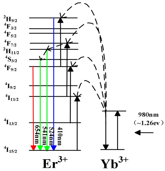Upconversion is a nonlinear optical phenomenon where the emission light has a shorter wavelength than the pump light source, which is an anti-Stokes process. Since the RE ions have long-lived excited states, the upconversion luminescent efficiency of RE-doped material is better than traditional photo-luminescent nanomaterials. Among the RE-doped upconversion nanomaterials, β-NaYF4:Yb3+, the Er3+ nanoparticle is the most efficient upconversion phosphor with bright green emission. This nanoparticle has attracted considerable attention [17,18,19]. As Figure 2 shows, under 980 nm laser excitation, the Yb3+ ion absorbs the photon energy and transfers it to the Er3+ ion for upconversion. Additionally, the wavelength of emission light is in the 410–654 nm range, which coincides with the absorption spectrum of PSC. Therefore, RE-doped upconversion material can be used to improve the PCE of PSCs, and RE ion doping TiO2 or perovskite nanocrystal is also an effective way for improving the photovoltaic performance of PSCs [20,21].
