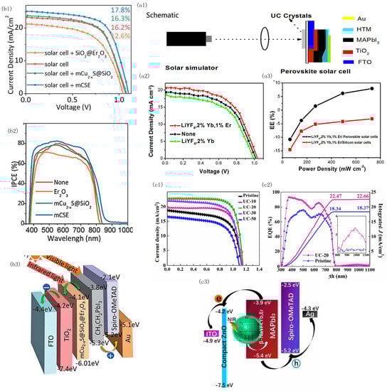 (a1) Schematic of the J–V characteristic curves measurement of the perovskite solar cells under the simulated sunlight excitation; (a2) J–V curves of the perovskite solar cells: LiYF4:2% Yb3+, 1% Er3+ crystals, LiYF4:2% Yb3+ crystals, and no crystal measured under simulated solar illumination with an intensity of 0.73 W·cm−2; (a3) Enhancement efficiencies (EE) of the perovskite solar cells and silicon solar cells with LiYF4:2% Yb3+, 1% Er3+ crystals dependent on the excitation power density. Reproduced with permission from [22]. American Chemical Society, 2016; (b1) J–V curves of the best-performing PSC, solar cell with SiO2@Er2O3, solar cell with mCu2−xS@SiO2, and solar cell with mCSE composites under simulated AM 1.5, 100 mW·cm−2 irradiance (simulated sunlight); (b2) IPCE curves of the best-performing PSC; (b3) Schematic illustration of the energy transfer process in CH3NH3PbI3 solar cells using mCSE composites. Reproduced with permission from [29]. Royal Society of Chemistry, 2017; (c1) J–V curves measured under AM 1.5 G of planar PSCs with different UCNCs additive amounts; (c2) IPCE spectra of UC-20 and pristine planar PSCs; inset is the magnification of 800–1100 nm region; (c3) Schematic energy transfer within a UCNCs-embedded planar PSC device. Reproduced with permission from [35]. Royal Society of Chemistry, 2017.