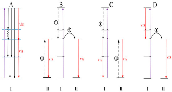 The schematic diagram of DC luminescence (① cross-relaxation ② energy transfer). (A) DC on a single ion by emission of two visible photons; (B–D) The possibility of DC on two ions. Reproduced with permission from [37]. The American Association for the Advancement of Science, 1999.