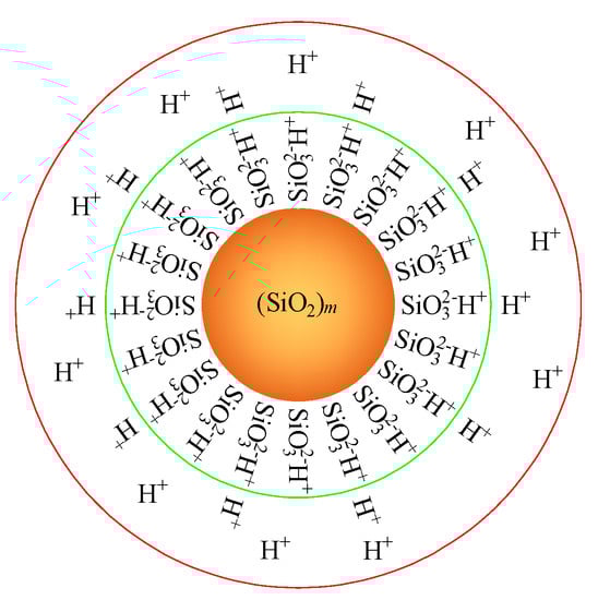 Silica sol is a stable liquid containing individual silica particles 8–12 nm in diameter []. The silica sol used for this study was provided by BASF HOCK Mining Chemical (China) Company Limited (Jining, China). Silica sol has an electric double layer structure, as shown in Figure 1. When ionic sodium is added, the electric double layer becomes thinner and the silica particles connect to form a gel. Some of the physical and chemical parameters [,] of the silica sol and NaCl catalyst are listed in Table 1. Gel time of silica sol to catalyst of 4:1, 7:1, and 9:1 (by volume) is 10 min, 2.67 h, and 9.33 h, respectively.
